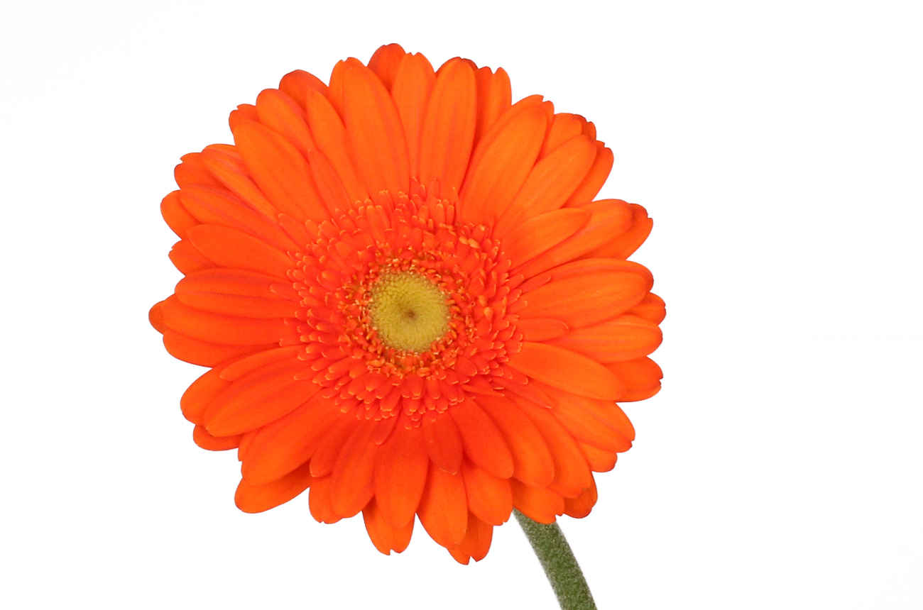 Оранжевая гербера с диаметром цветка 10-12 см и длиной стебля 50-60 см. Красивый цветок семейства астровых, напоминающий большую ромашку.Поэтому цветок имеет второе название - transvaal daisy — «трансваальская ромашка». Цветок кажется очень естественным и простым, "природным", но в то же время он довольно крупный и пышный.